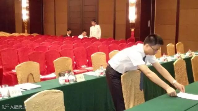工作人员有的紧张有序地打扫卫生,保证会场每个角落干净整洁。有的进行会议摆台,注意每一个细节。有的对会场细节做复核检查。