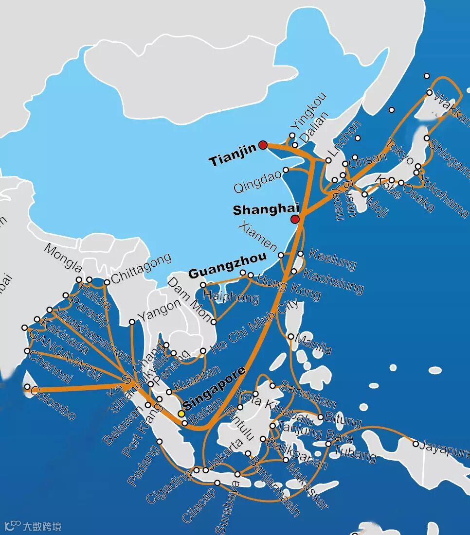 包括从远东日本、韩国、中国等主要港口到东南亚所有国家包括斯里兰卡和印度东岸各港口