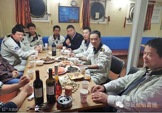 晚饭刚过不久,政委就组织了几个弟兄在厨房忙着切肉洗菜。要开小灶吗?不错,因为今天要为我轮余运增老轨庆祝生日,大家都要一展厨艺为他献上拿手好菜呢。晚上的生日宴会上,船员们以及随船专家都到餐厅为老轨同祝。赠送的生日礼物、贡献的上好红酒、或是一句简单的祝福,让余老轨留下了难忘的记忆。