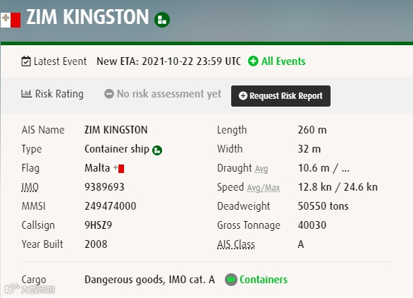 该轮服务于马士基ZP9航线;曾挂靠国内高雄、厦门、盐田、宁波和上海除了ZIM,共舱的船公司还有ALIANÇA、GOLD STAR LINE、HAMBURG SÜD、MAERSK、MCC。