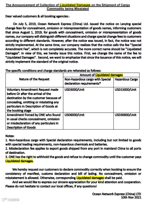 船公司特发通知: 订舱时瞒报、漏报、错报,都将产生违约金!!!