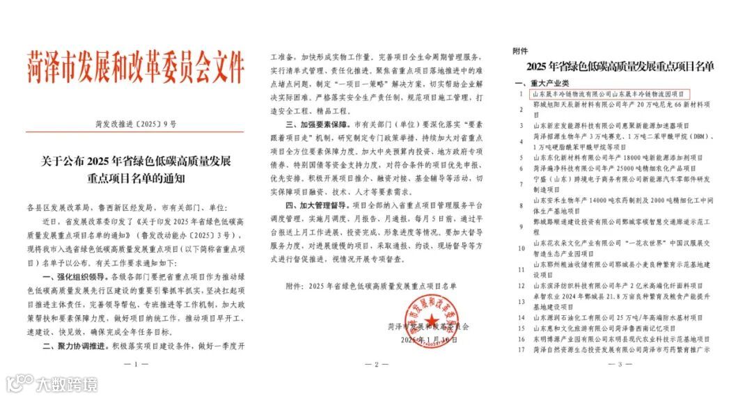 2025年1月2日,山东省发展和改革委员会正式发布《2025年山东省绿色低碳高质量发展重点项目名单》,菏泽城投集团下属山东晟丰冷链物流有限公司投资承建的“山东晟丰冷链物流园项目”成功入选。该项目凭借先进的绿色低碳技术和创新的运营管理模式,被列为山东省重大产业类绿色低碳高质量发展重点项目。