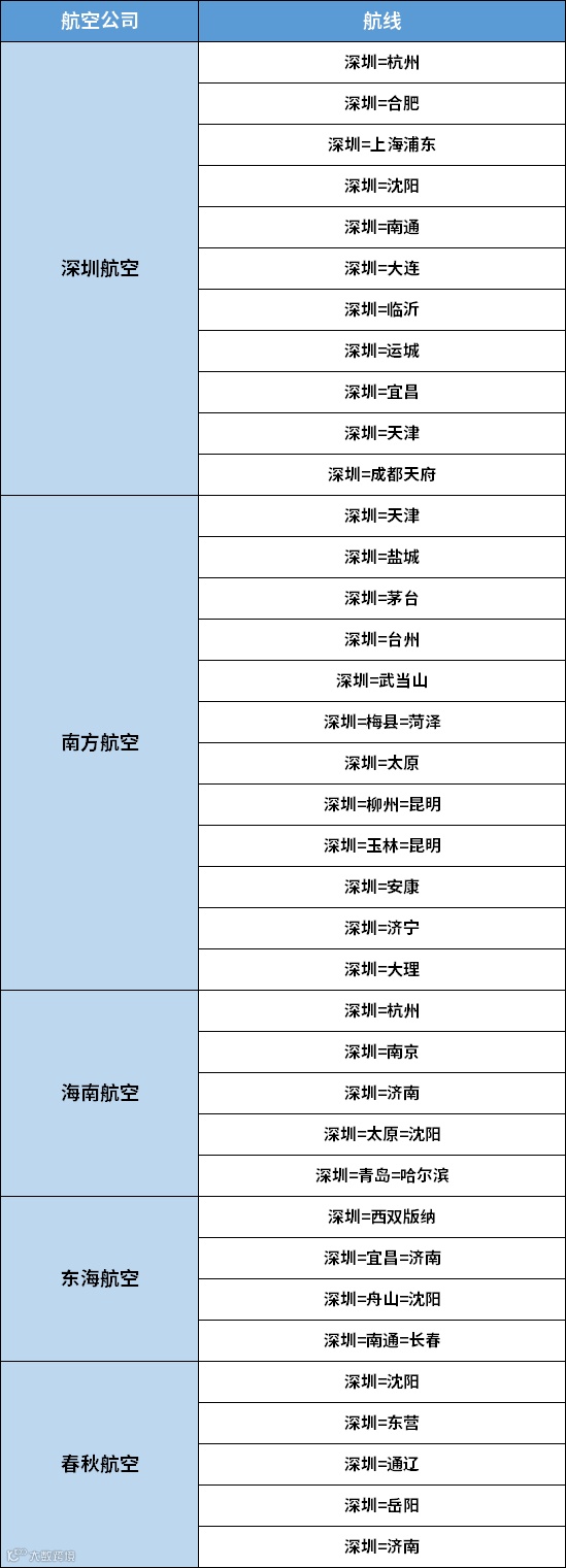 加密深圳至成都、杭州、南京、沈阳、哈尔滨、呼和浩特、大连、武汉、天津、台州、菏泽等37条热门航线,其中深圳往返成都、杭州、南京等地的精品商务快线时刻、班次将进一步优化。