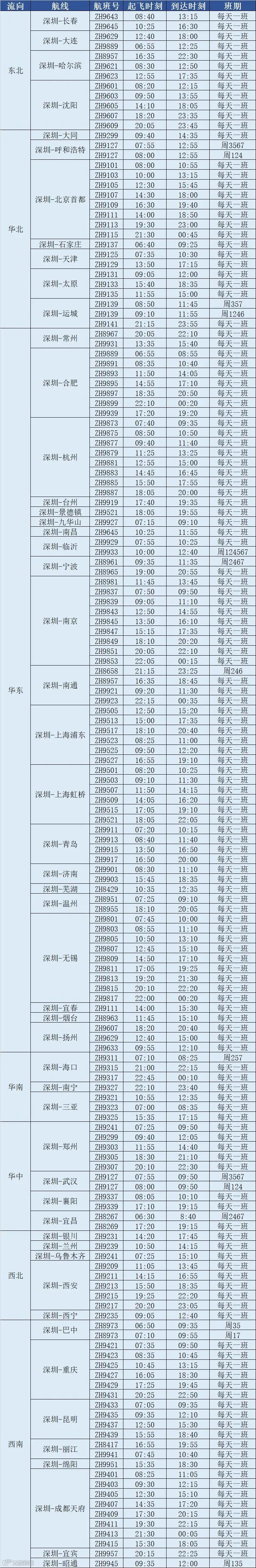 深航大湾区内始发航班一览