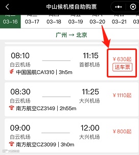 3.选择带“送车票”字样的航班,并按指引填写乘机人信息,支付出票。(如下图)