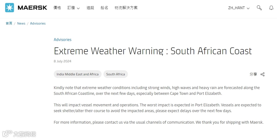 7月8日,航运巨头马士基发布“极端天气警告”称,极端天气和席卷南非海岸的风暴潮预计将导致航运延误。