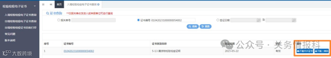 二、检验检疫电子证书系统取消《入境货物检验检疫证明》凭短信查询码免登录查询功能。