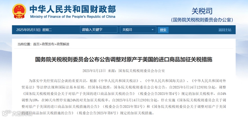为落实中美经贸高层会谈的重要共识,根据《中华人民共和国关税法》、《中华人民共和国海关法》、《中华人民共和国对外贸易法》等法律法规和国际法基本原则,经国务院批准,国务院关税税则委员会公布公告,自2025年5月14日12时01分起,调整《国务院关税税则委员会关于对原产于美国的进口商品加征关税的公告》(税委会公告2025年第4号)规定的加征关税税率,由34%调整为10%,在90天内暂停实施24%的对美加征关税税率。自2025年5月14日12时01分起,停止实施《国务院关税税则委员会关于调整对原产于美国的进口商品加征关税措施的公告》(税委会公告2025年第5号)和《国务院关税税则委员会关于调整对原产于美国的进口商品加征关税措施的公告》(税委会公告2025年第6号)规定的加征关税措施。