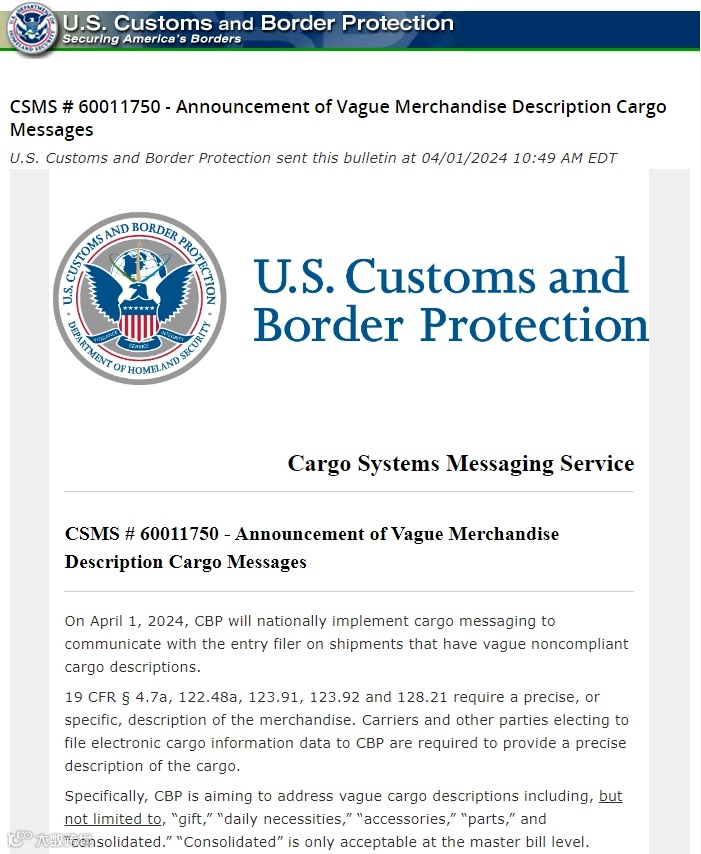 事实上,美国海关和边境保护局(CBP)在四月初就通过官方发出预警,公布了一则关于货物信息中含糊商品描述货物的公告。公告明确指出,自2024年4月1日起,CBP将与美国所有港口联手,对货物信息传递进行实施,并与入境申报人就货物描述模糊、不合规的货物进行沟通、调查。