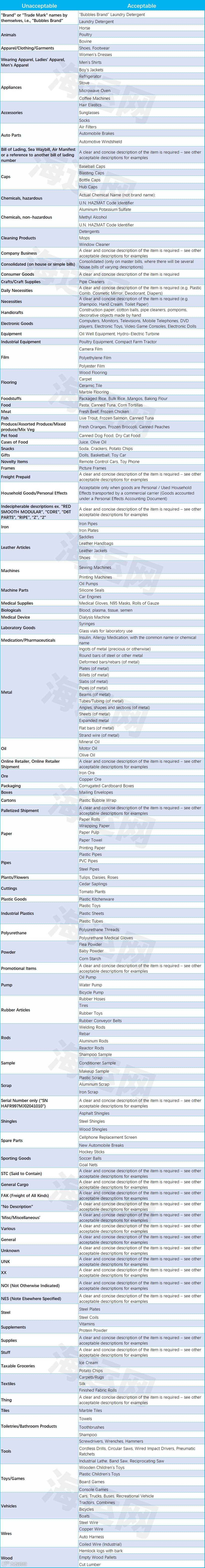 下列清单由美国海关及边境保护局提供,是可接受和不可接受描述的指南。此列表并非详尽无遗,并将随着不可接受的描述的确定和可接受的描述的进一步细化而继续完善。“可接受”列中的描述应仅视为其实际描述的项目的示例,而不是特定可接受或限制性术语的列表。