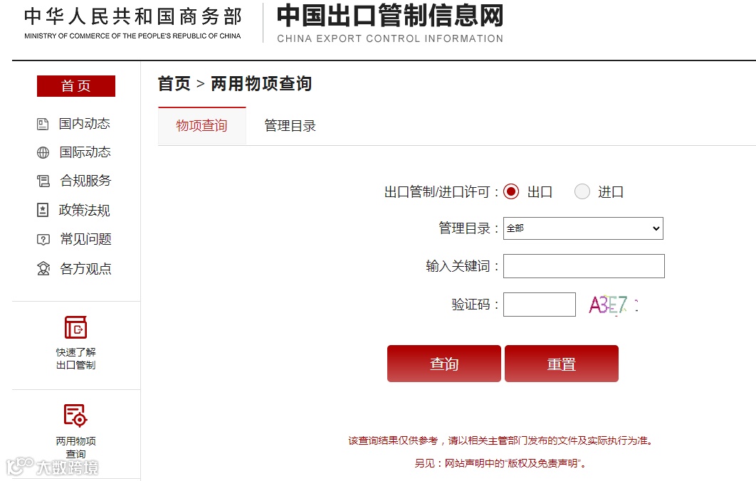 最直接简单的方式,就是对照上述《两用物项和技术进出口许可证管理目录》进行检索、查找,将相关物品与《两用物项和技术进出口许可证管理目录》中的描述进行比照、验证。同时,也可在中国出口管制信息网页面左侧功能栏的“两用物项查询”中,输入商品及技术名称进行查询。