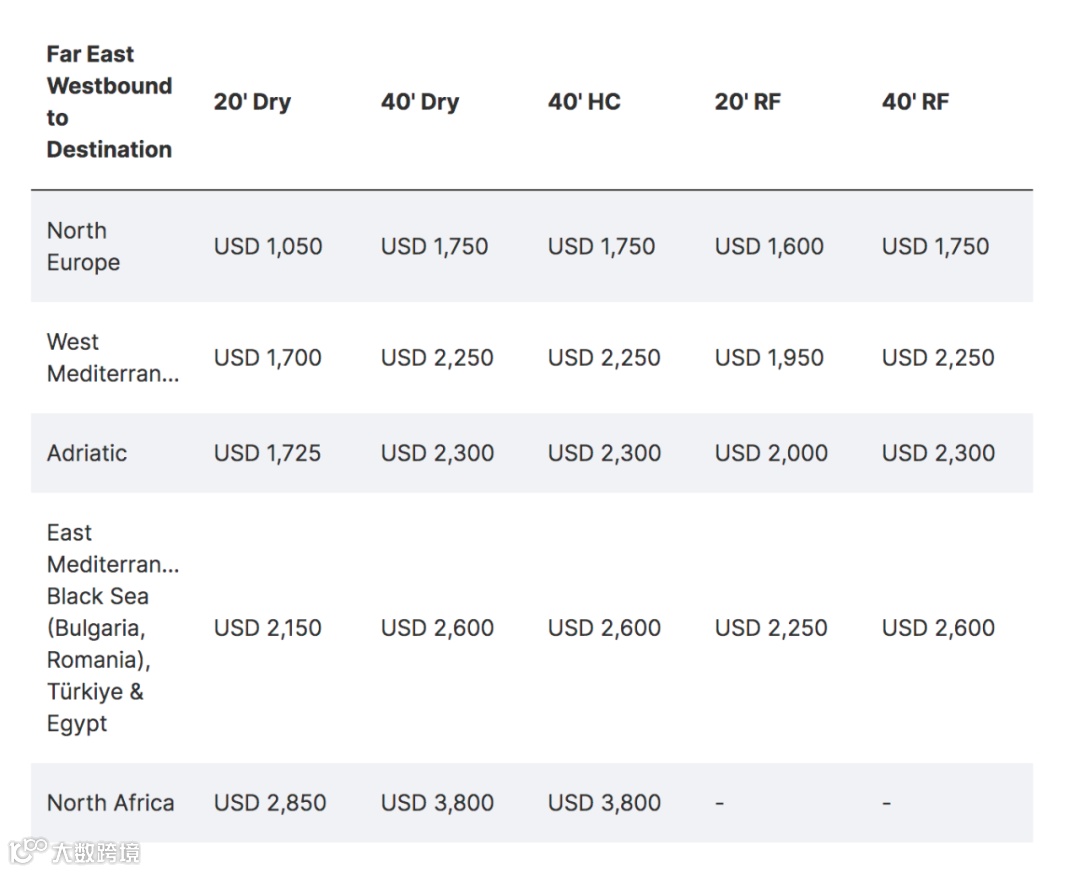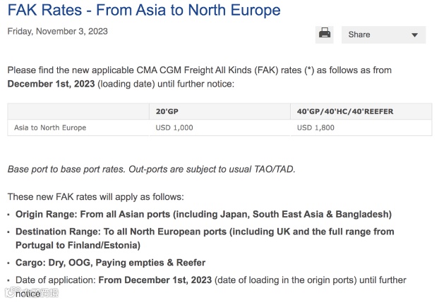 自2023年12月1日(装货日期)起生效,直至另行通知。收费标准为:1000美元/TEU,1800美元/FEU。