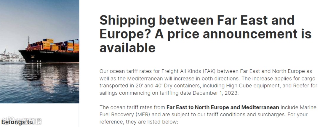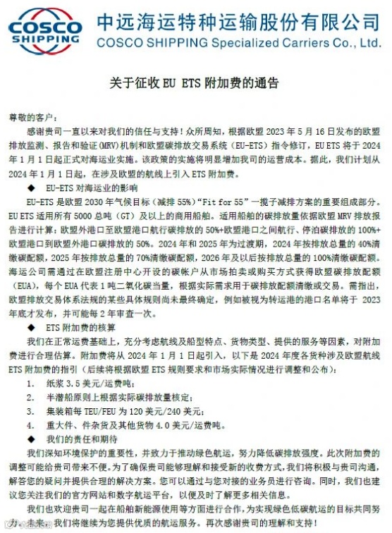 鉴于欧盟碳排放交易系统(EU-ETS)将于2024年1月1日起正式对海运业实施,将明显增加其运营成本,因此,该公司计划从2024年1月1日起,在涉及欧盟的航线上引入ETS附加费。