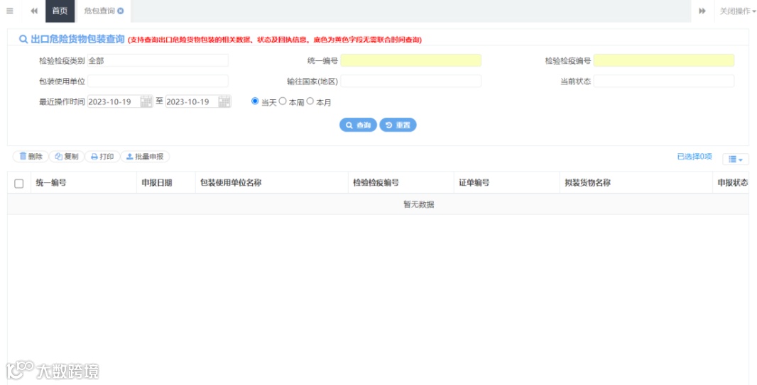 出口危险货物包装证单查询是指申请单位根据申请单号、申请时间等信息,查询海关出具的证单信息并下载。