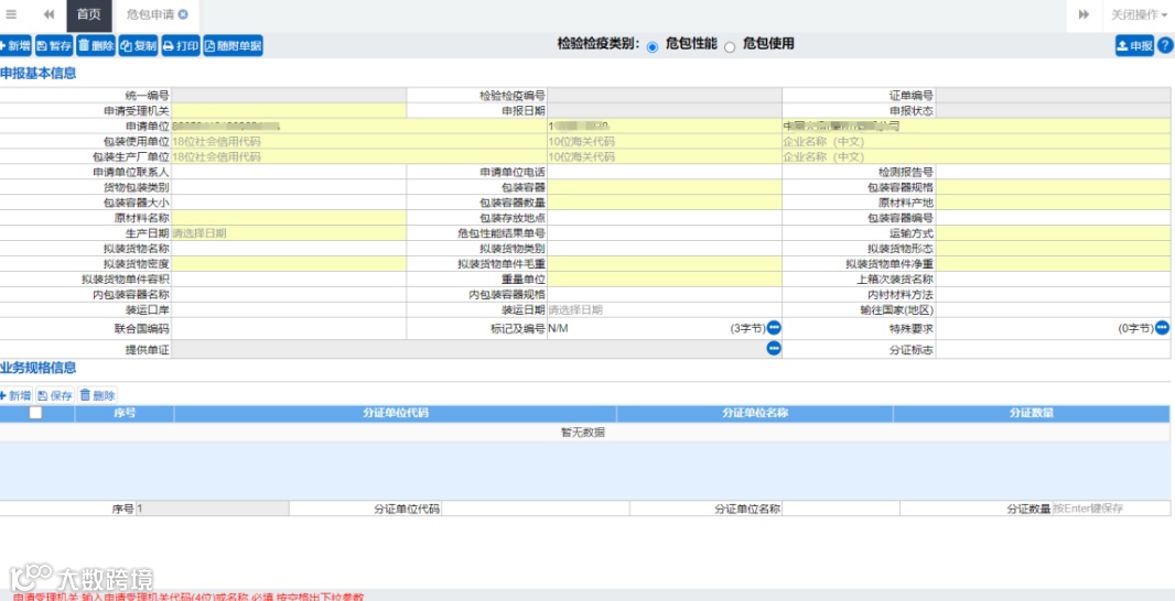 1.灰色字段(例如统一编号、检验检疫编号、证单编号、申报日期、申报状态等)表示不允许录入,系统将根据相应操作或步骤后自动返填。申请受理机关、包装容器、原材料产地等字段,需要在参数中进行调取,不允许随意录入。