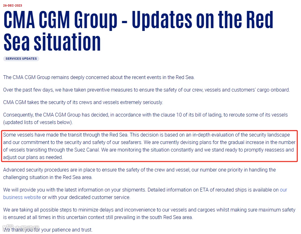 不过12月26日CMA CGM表示目前正在制定计划,逐步增加通过苏伊士运河的船只数量,同时正在不断监测局势,并随时准备根据需要迅速重新评估和调整计划。