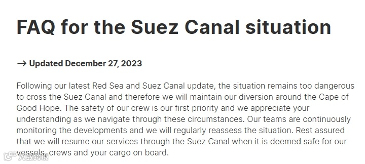 12月27日,马士基称未来几周将安排数十艘集装箱船经由苏伊士运河和红海。但其大部分船舶仍然选择绕行好望角。马士基也强调,目前红海的整体风险尚未消除,如安全形势出现变化,其将重新评估。