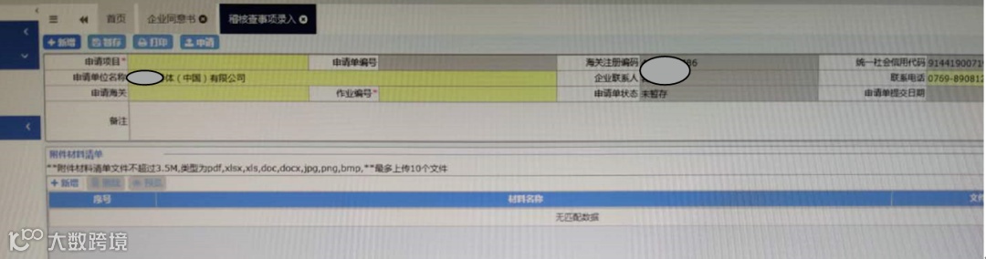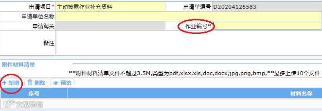 6、在“申请海关”栏录入关区代码,在“主动披露报告”、“附件材料清单”项下点击新增,然后上传相关资料,注意按要求调整上传资料格式。