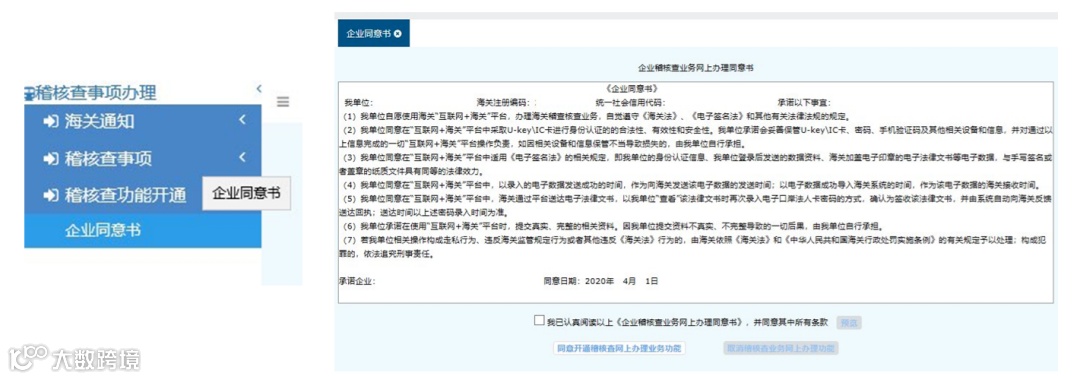 4、点击“稽核查功能开通”链接,开通稽核查办理功能,签署《企业同意书》。