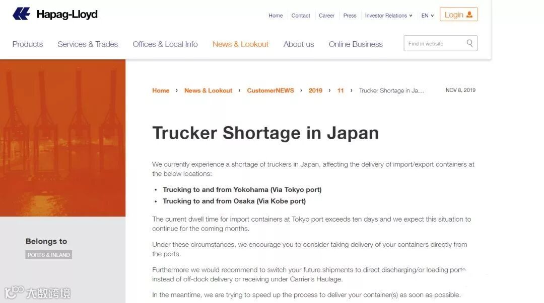 出货至日本的货主注意了!由于拖车司机严重短缺,进口到日本港口的集装箱遭到滞留和延迟的情况。