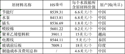 例如:中国生产的水族箱(HS7013.99)(FOB价58美元/个),所使用的原料如下: