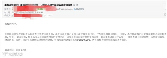 日前有船公司的发送邮件通知,再次重发提示:重视货物安全运输,订舱时正确申报货名及货物性质。现在有很多物流公司为了一己私利在没有任何资料的情况下冲发纯电池产品,导致整柜出不去并面临高额罚款,这样不但影响了那条柜里面发普货客户货物的时效,也影响到了普货的安全性。这样做对于那些发普货的客户来说是极其不负责的。