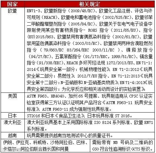 出口玩具还需符合输入国家或者地区的技术法规和标准的要求,国外对玩具的安全标准主要涉及玩具的机械物理性能、阻燃性能、化学要求和电性能等几个方面主要出口国的相关规定如下: