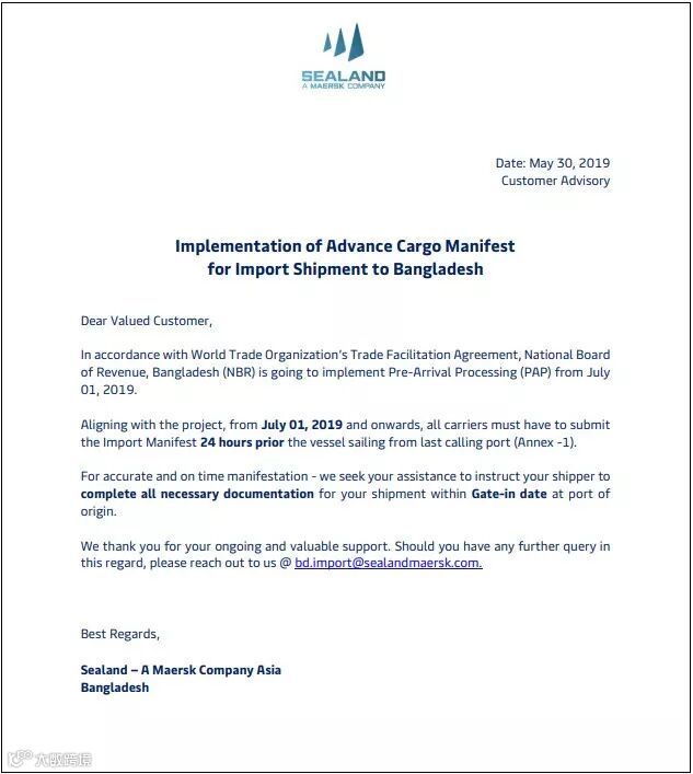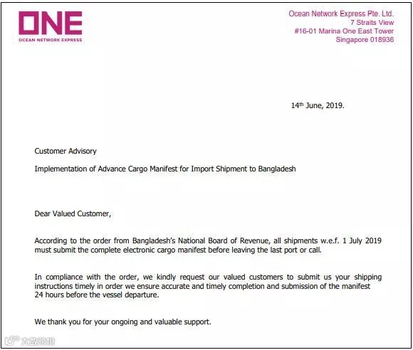 孟加拉国航运代理协会发布已于近日发布相关紧急新规通知,ONE、马士基Sealand等船公司,也已经纷纷发出通知,告知客户为舱单提前申报做好准备。