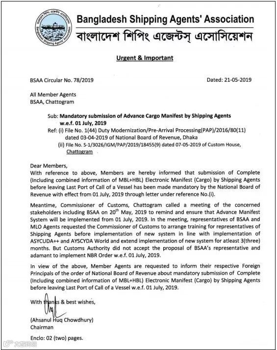 7月1日起,孟加拉国国家税务局要求必须在最后一个停靠港启航前24小时,提交完整的船舶代理电子舱单信息(含MBL+HBL组合信息)。
