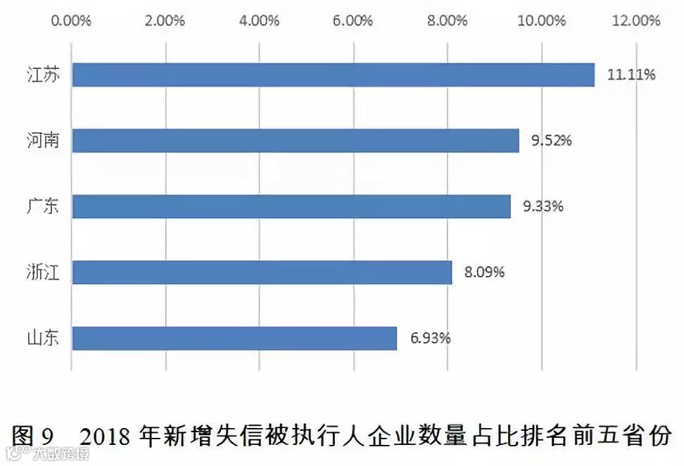 失信被执行人:2018年新增失信被执行人261.4万个。从地区分布看,新增失信被执行人企业主要集中在江苏、河南、广东、浙江、山东等地,以上五省份失信被执行人企业数量之和占全国总数的44.98%(见图9)。从涉案金额看,472家企业涉案金额超亿元,其中涉案金额在5亿元及以上的有30家(见表2)。从新增失信被执行人记录数量看,332家企业新增记录超过50条,其中26家企业新增记录超过200条,单个企业新增记录最高达998条(见表3)