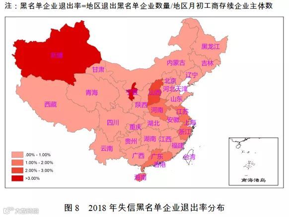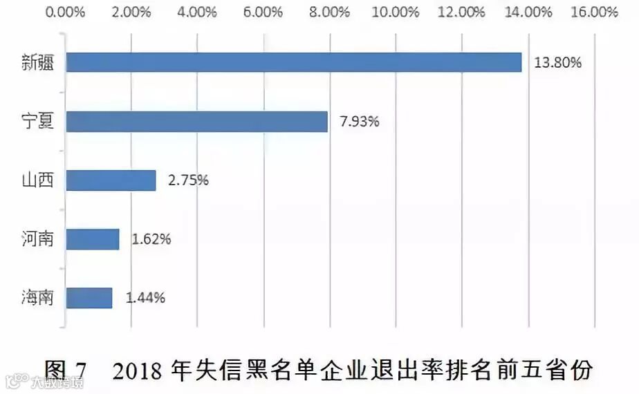 从2018年各地区黑名单企业退出率来看,退出率较高的五省份为新疆、宁夏、山西、河南、海南。在失信黑名单主体退出数量和本地区失信黑名单主体退出率两个指标上,新疆、河南两地均位居全国前列(见图7和图8)。