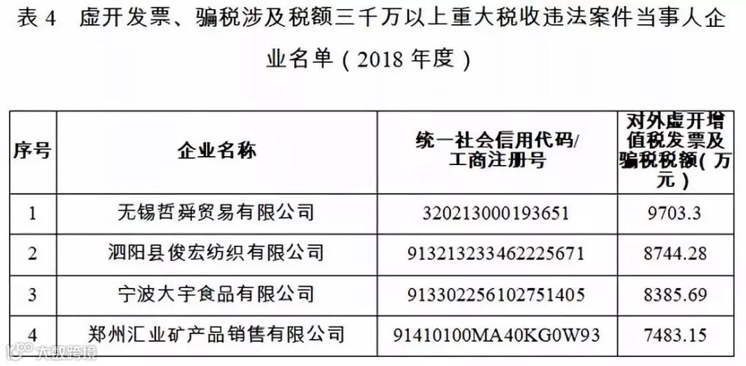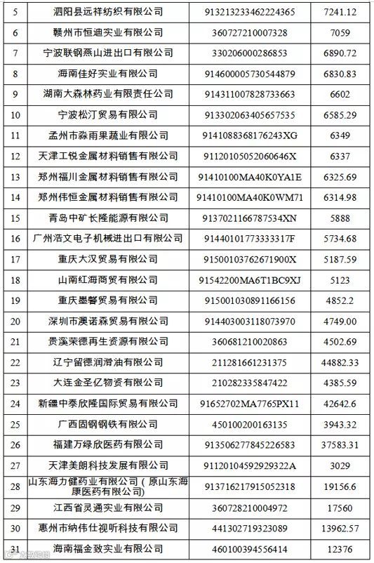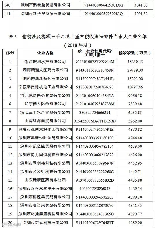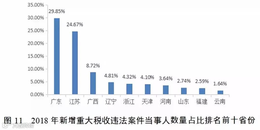 重大税收违法案件当事人:2018年新增重大税收违法案件当事人8836家。从地区分布看,主要集中在广东、江苏、广西三省份。其中,广东当事人企业数量最多,占比29.85%(见图11)。从违法行为看,141家当事人企业涉及对外虚开增值税发票、骗税且涉及税额三千万以上(见表4),41家企业涉及偷税且涉及税额三千万以上(见表5)。