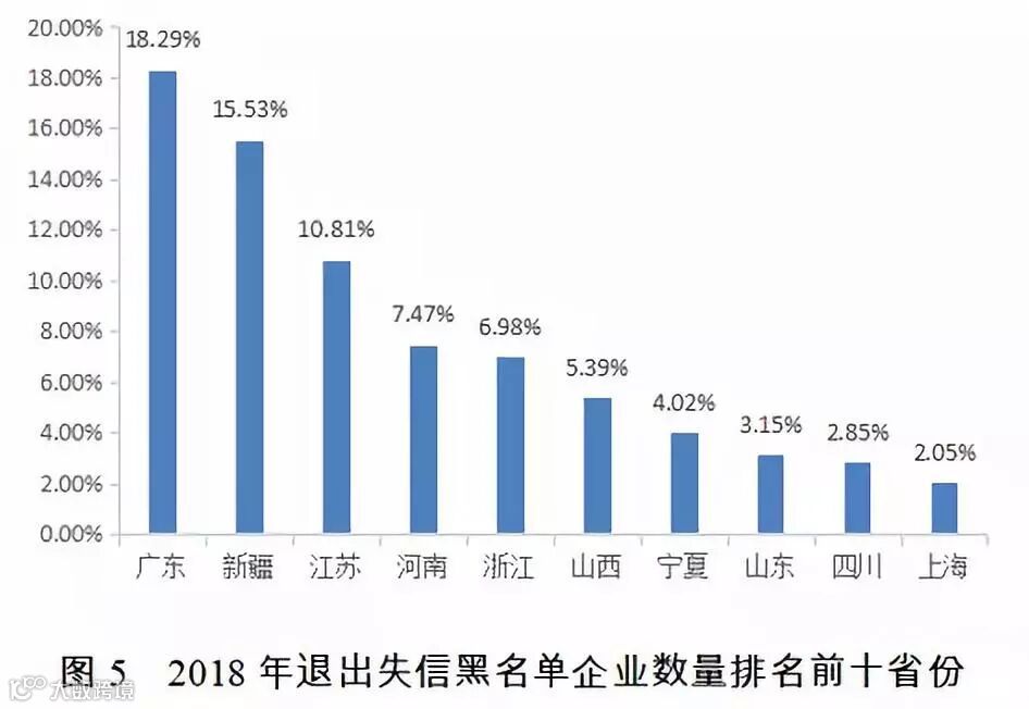 2018年全国退出失信黑名单主体217.52万个。从地区分布看,退出失信黑名单企业数量排名前五的省份为广东、新疆、江苏、河南、浙江。其中,广东退出黑名单企业数量占比最高,占退出总数的18.29%;其次是新疆,占比15.53%。(见图5和图6)。