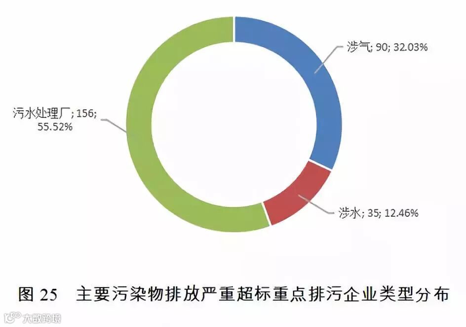 从企业类型来看,污染物超标排放主要集中在污水处理厂,涉及156个单位,占总数的55.22%;涉气企业90家,占总数的32.03%;涉水企业35家,占总数的12.46%(见图25)。