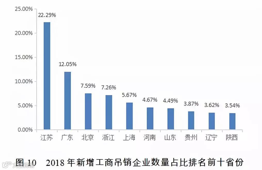 工商吊销企业:2018年新增工商吊销企业95.79万家,主要集中在江苏、广东、北京、浙江、上海等地区。其中,江苏工商吊销企业数量最多,占全国总数的22.29%(见图10)。