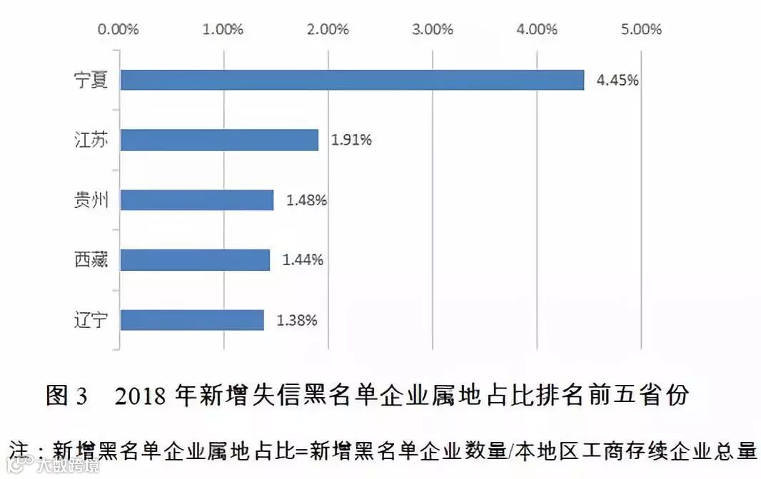 从2018年新增失信黑名单企业数占所在地企业总数的比例看,属地占比较高的五省份为宁夏、江苏、贵州、西藏、辽宁。其中,宁夏新增黑名单企业属地占比最高,为4.45%。新增失信黑名单企业属地占比最低的五省份为内蒙古、湖南、广西、甘肃、吉林(见图3和图4)。