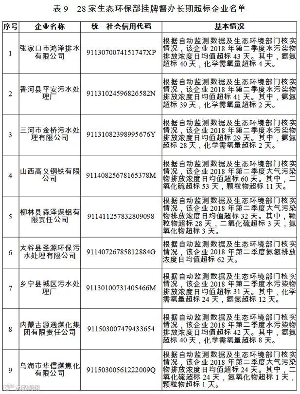 另外,生态环境部还公布了2018年已连续两个季度严重超标且第二季度结束时仍未整改完成的28家企业名单。从地区分布看,涉事企业分布于12个省份,其中新疆企业数量最多,共9家,其次是山西、河北两地,分别涉及4家及3家(见图27、表9)。
