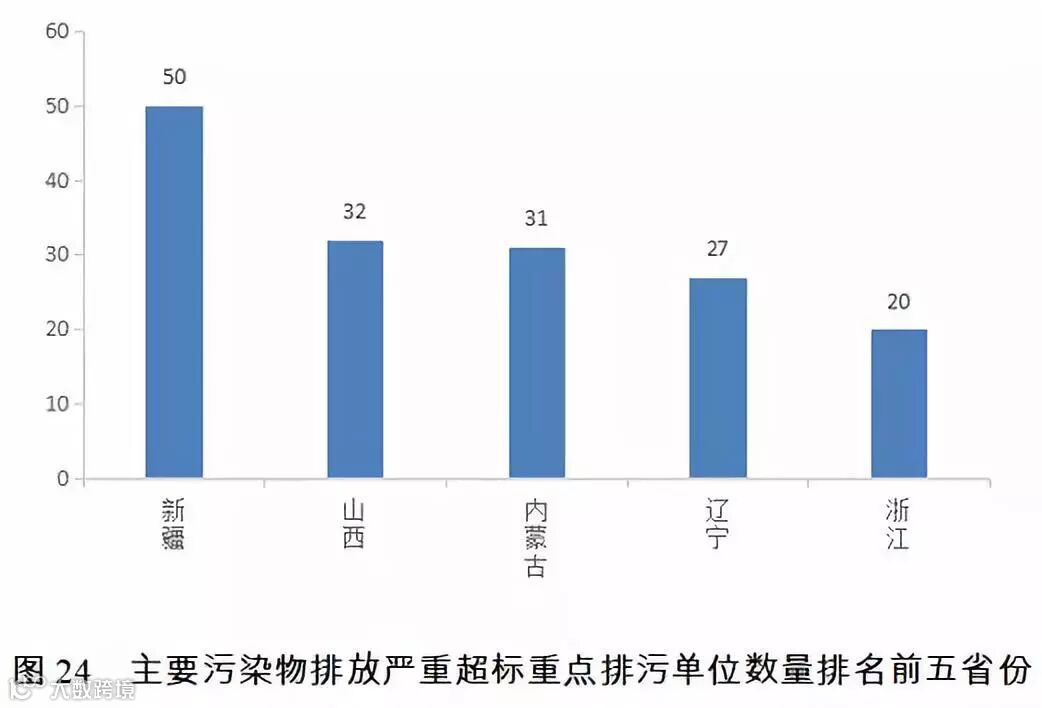 2018年,生态环保部公布了281家污染物排放严重超标重点排污单位名单。从地区分布看,严重超标企业主要集中在新疆、山西、内蒙古、辽宁、浙江等地,以上五省份企业数量之和达160家,占全国总数的56.94%。其中新疆企业数量最多,有50家,占全国总数的17.79%(见图24)。