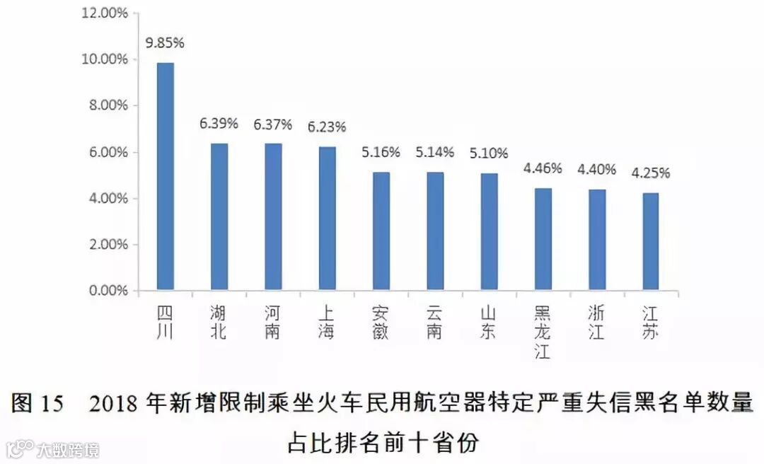 限制乘坐火车民用航空器特定严重失信黑名单:2018年新增限制乘坐火车民用航空器处罚记录6959条,涉及当事人6908个,主要集中在四川、湖北、河南、上海等省份,其中,四川处罚记录数量最多,占全国总数的9.85%(见图15)。