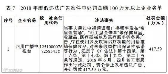 从处罚金额看,66家企业的处罚金额在50万元以下,占总数的66.67%;12家企业的处罚金额在100万元以上,占总数的12.12%。其中,四川广播电视台因存在使用涉及疾病治疗功能的用语推销保健食品、对未来收益作出保证性承诺等行为,被四川省工商行政管理局责令停止发布违法广告,并处罚金417.59万元(见图21、表7)。
