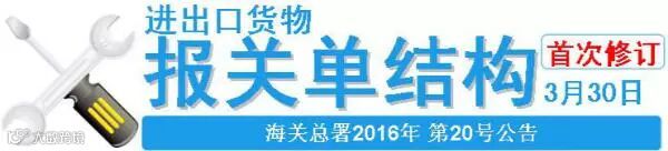 由于本次报关单结构进行了首次修订,同时进出口报关单填制规范发生相应变化。具体变化内容及相关信息,请留意海关总署官网 海关总署2016年20号公告。