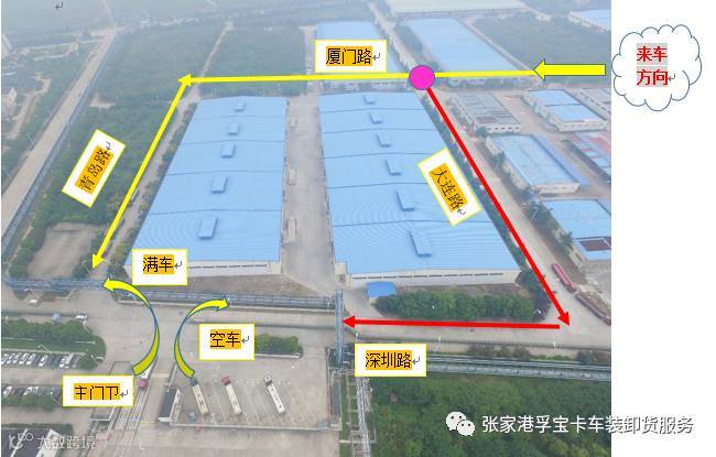 空载车辆进入路线:沿下图中红色路线行驶。进入园区卡口后,左拐进入“大连路”,开到头再右拐经“深圳路”进入孚宝停车场