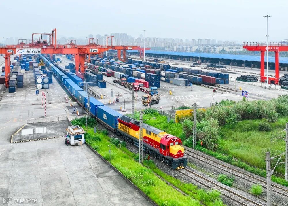 ▲2023年6月7日,一列国际铁路班列从重庆团结村中心站缓缓驶出。截至目前,重庆市国际铁路班列累计开行超2.2万列、集装箱超150万标箱,居全国第一。记者 张锦辉 摄