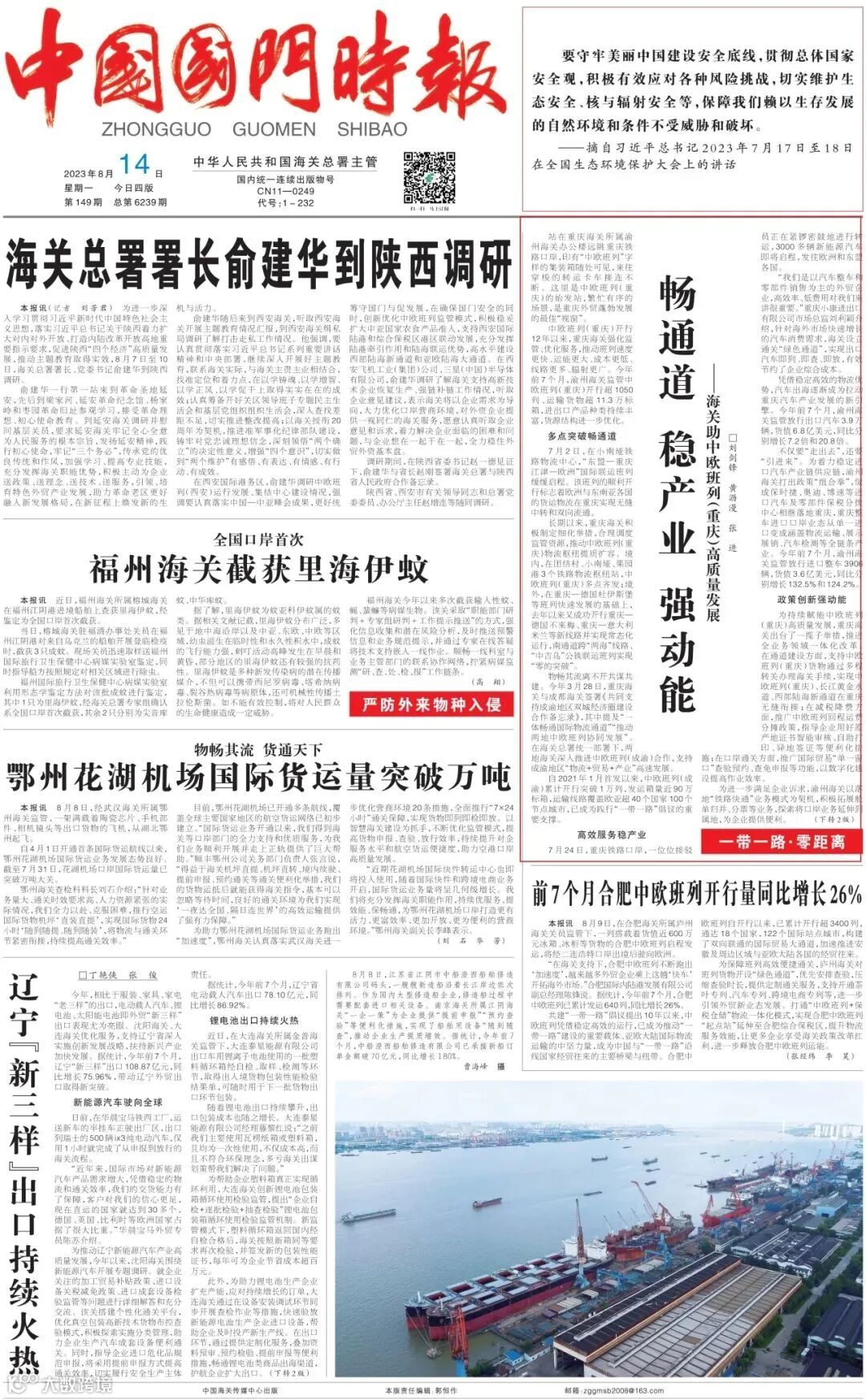 为持续赋能重庆中欧班列高质量发展,重庆海关出台了一揽子举措,推进全业务领域一体化改革。在通道建设方面,支持重庆中欧班列货物通过多程转关办理海关手续,实现重庆中欧班列、长江黄金水道、西部陆海新通道在重庆无缝衔接;在减税降费方面,推广中欧班列回程运费分摊政策,指导企业用好原产地证书智能审核、自助打印、异地签证等便利化措施;在口岸通关方面,推广国际贸易“单一窗口”查验预约、查免申报等功能,以数字化建设提高作业效率。