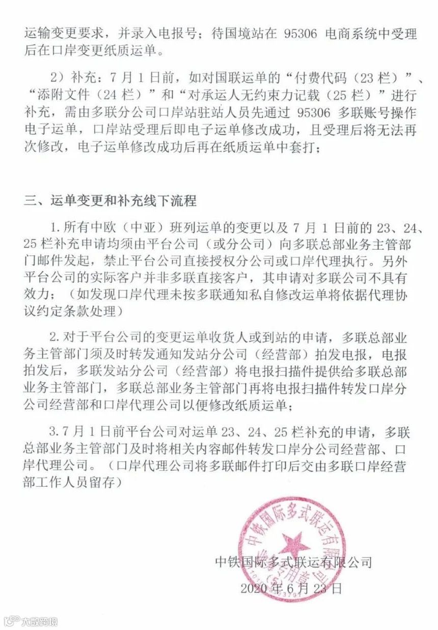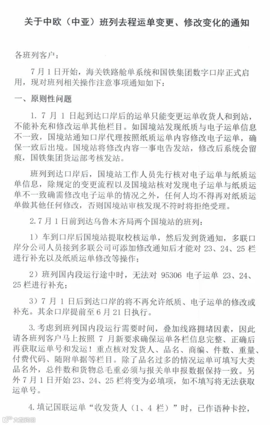 您们好!接中铁通知,海关铁路舱单系统和国铁集团数字口岸将于7月1日起正式启用,中欧(中亚)去程班列,除收货人和到站外,其他各栏均不再允许修改。请广大客户务必提前确认好境外代码、随附文件、品名、重量等相关信息,以避免产生不必要的损失。另常规国联也将陆续出现此类要求,故此特请各位客户务必提前做好数据信息确认工作!