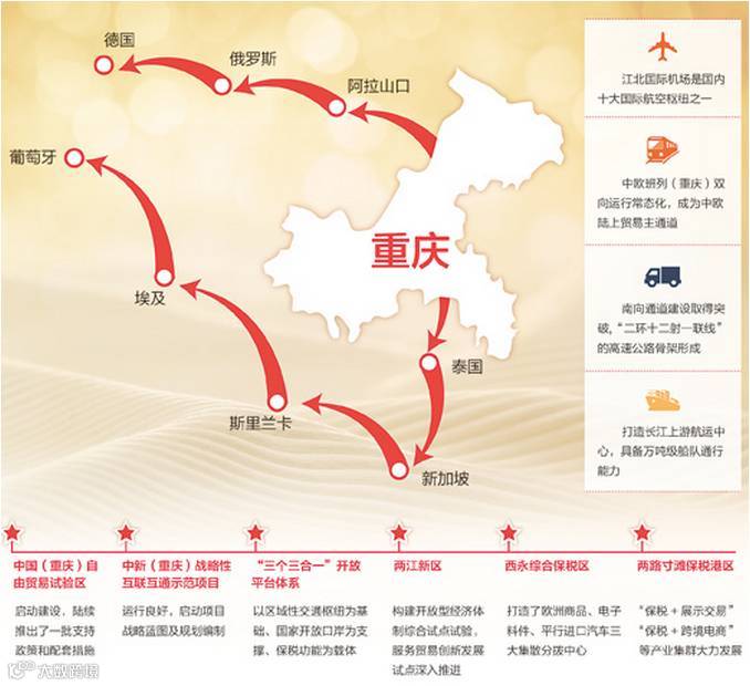 中欧班列(重庆)从重庆经由新疆阿拉山口出国门,经哈萨克斯坦、俄罗斯、白俄罗斯、波兰等国,最终抵达德国杜伊斯堡。