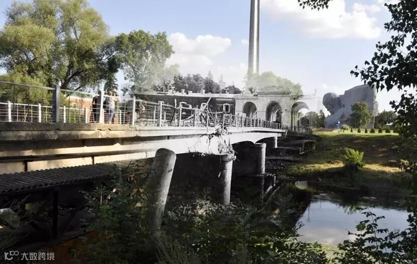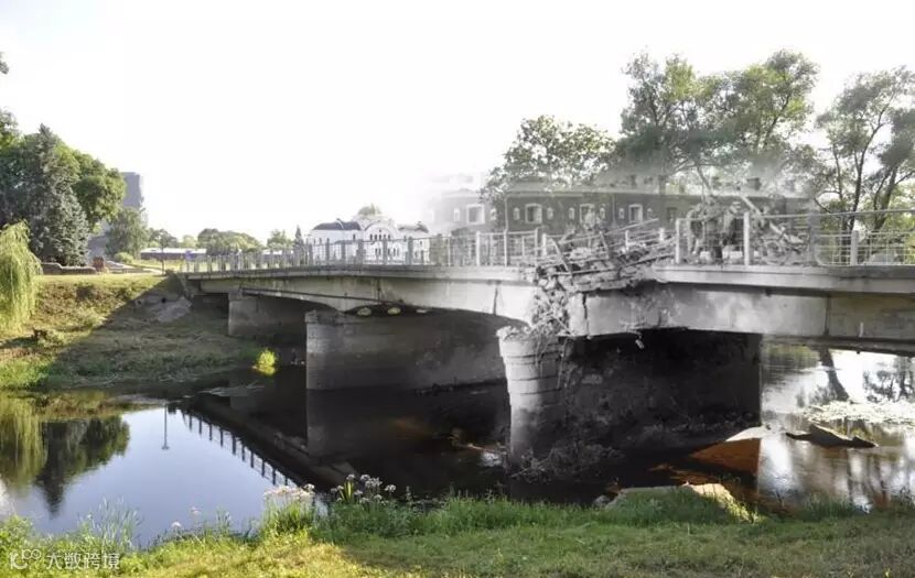 当年战火损毁的桥梁,远处可以看到修复的教堂