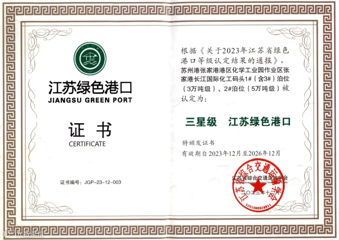12月25日,从江苏省综合交通运输学会工作会议传来喜讯,保税科技集团长江国际获评“江苏省三星级绿色港口”。