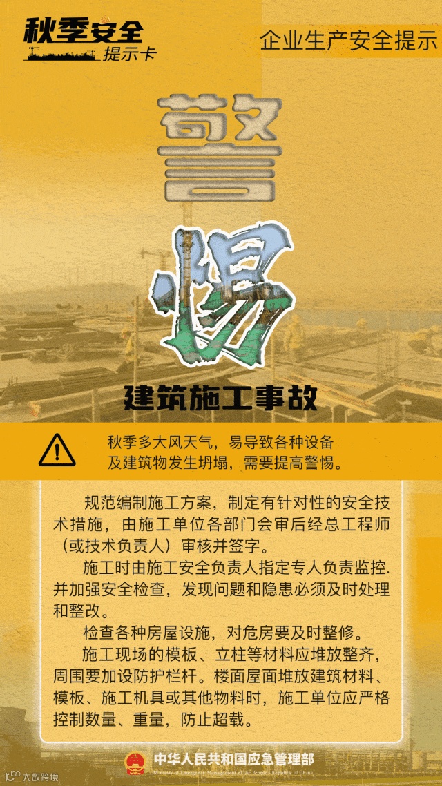 秋季是建筑工程施工的旺季,但秋季多大风天气,易发生坍塌、高坠等事故,需提高警惕。