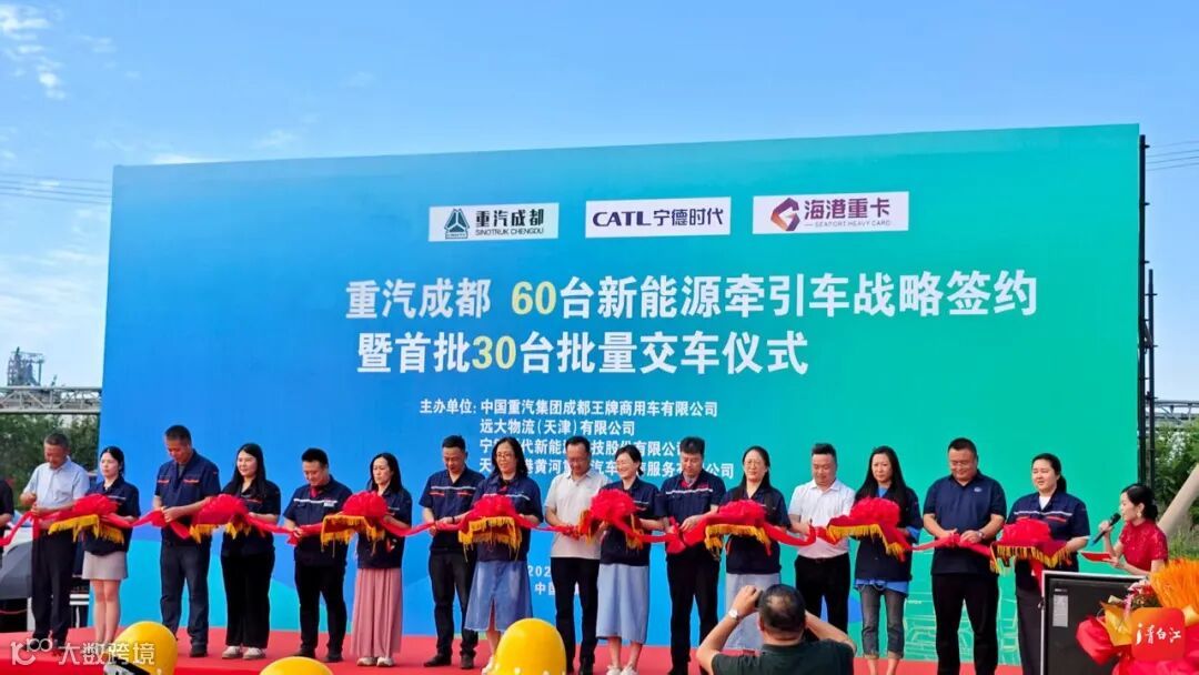 中国重汽集团成都商用车有限公司(以下简称“重汽成商”)在天津成功举办签约仪式,与客户达成60台V7-X新能源牵引车的战略合作,并同步完成30台新车的交付。此次签约是客户在去年首批采购20台纯电牵引车并实现一年高效运营后,对重汽成商产品品质与服务保障的再度认可。